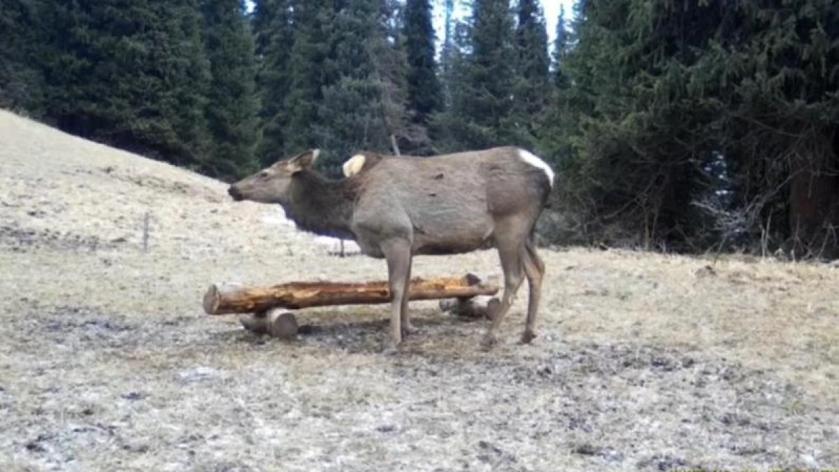 На территории Государственного национального природного парка «Көлсай көлдері» видеоловушка, установленная на специальной биотехнической площадке, зафиксировала алтайского оленя (марала).