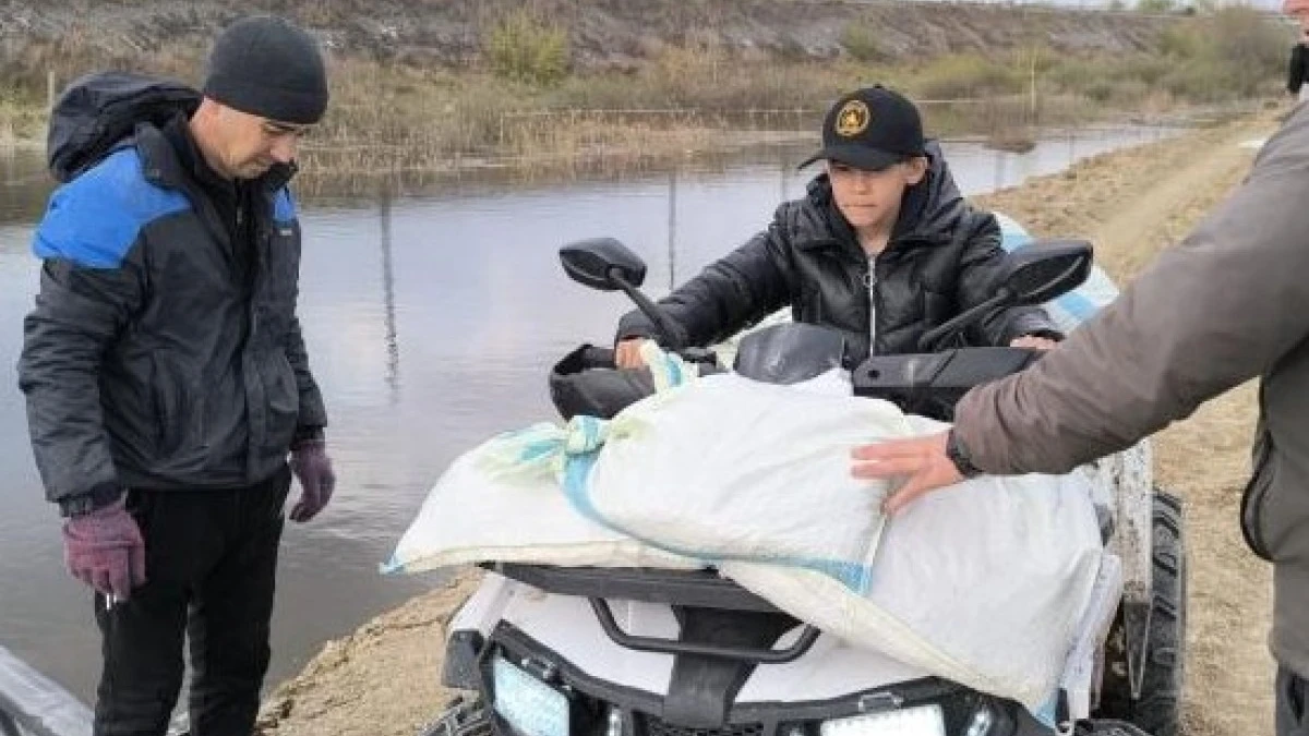 Их сын Дастан тоже вносит свой вклад: на своём квадроцикле он помогает взрослым, перевозя мешкотару для укрепления защитных сооружений.