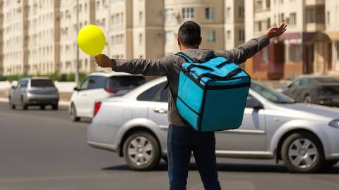 Мужчина с фирменной сумкой службы доставки и с жёлтым шариком в руках вышел на проезжую часть и начал хаотично «управлять» автомобилями, сообщает Malim.kz со ссылкой на Lada.kz.